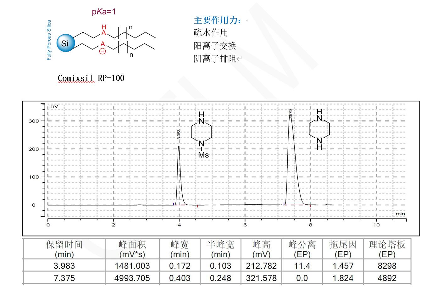 菲羅門Comixsil RP-100 HPLC混合模式色譜柱分離哌嗪和 1-(甲磺?;┻哙?/span>