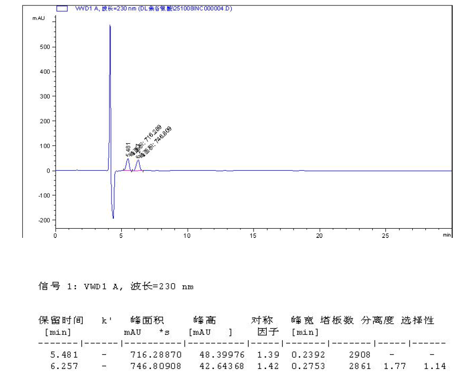 App ID: FLM-B250021 DL-焦谷氨酸的手性分析 方法:自定 色譜柱:Chiral INC 5μm 250×4.6 mm 貨號(hào):FMG-JY5-I03 流速:0.6 mL/min 檢測(cè):UV230nm 樣品濃度:1 mg/mL 進(jìn)樣量:2 μ 流動(dòng)相:咨詢 色譜圖: